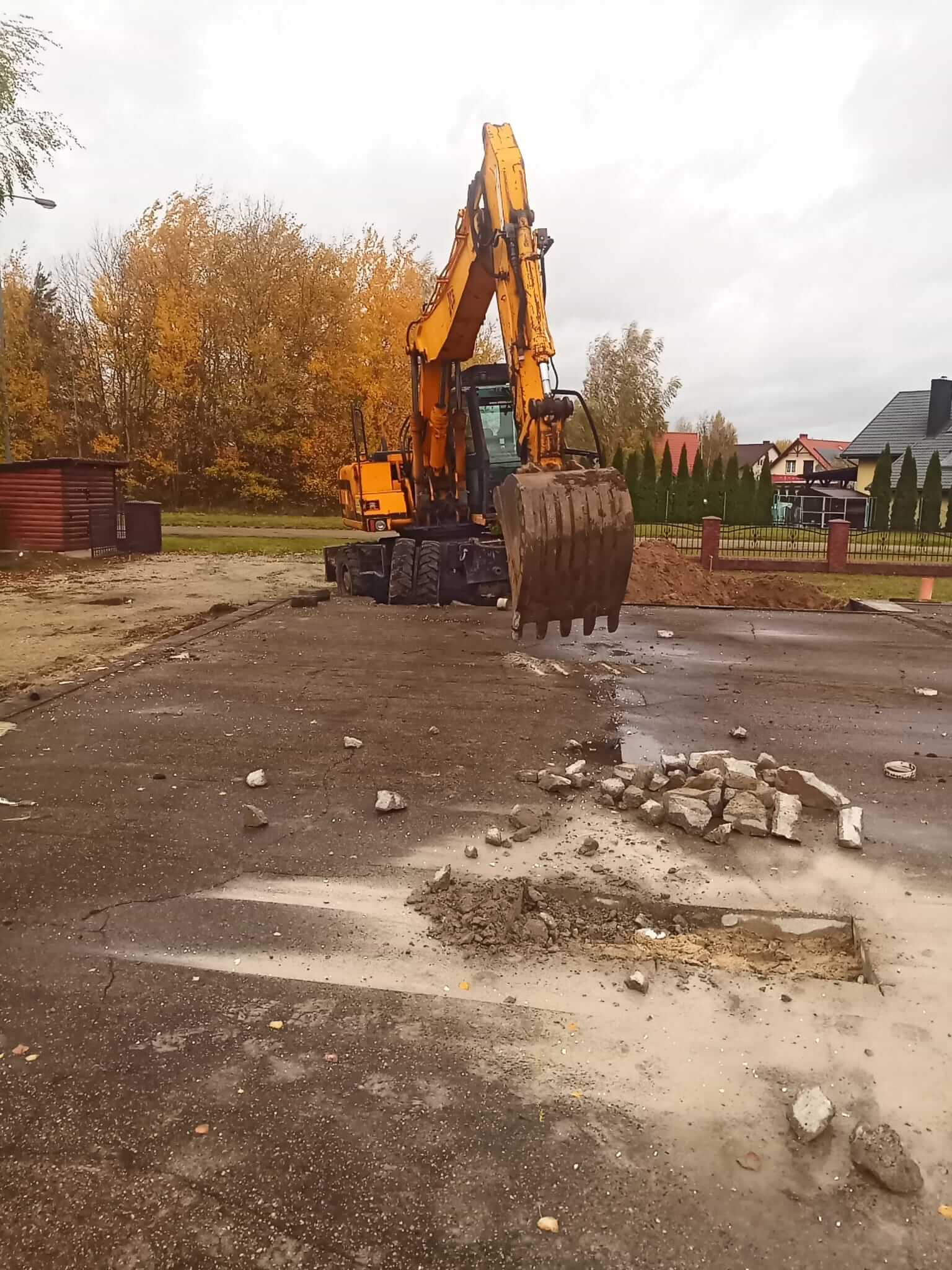 Ustalamy z klientem termin. Tego dnia zabieramy się do wyburzenia. Na miejscu zjawia się operator z maszyną. Zabezpieczamy teren i rozpoczynamy pracę.